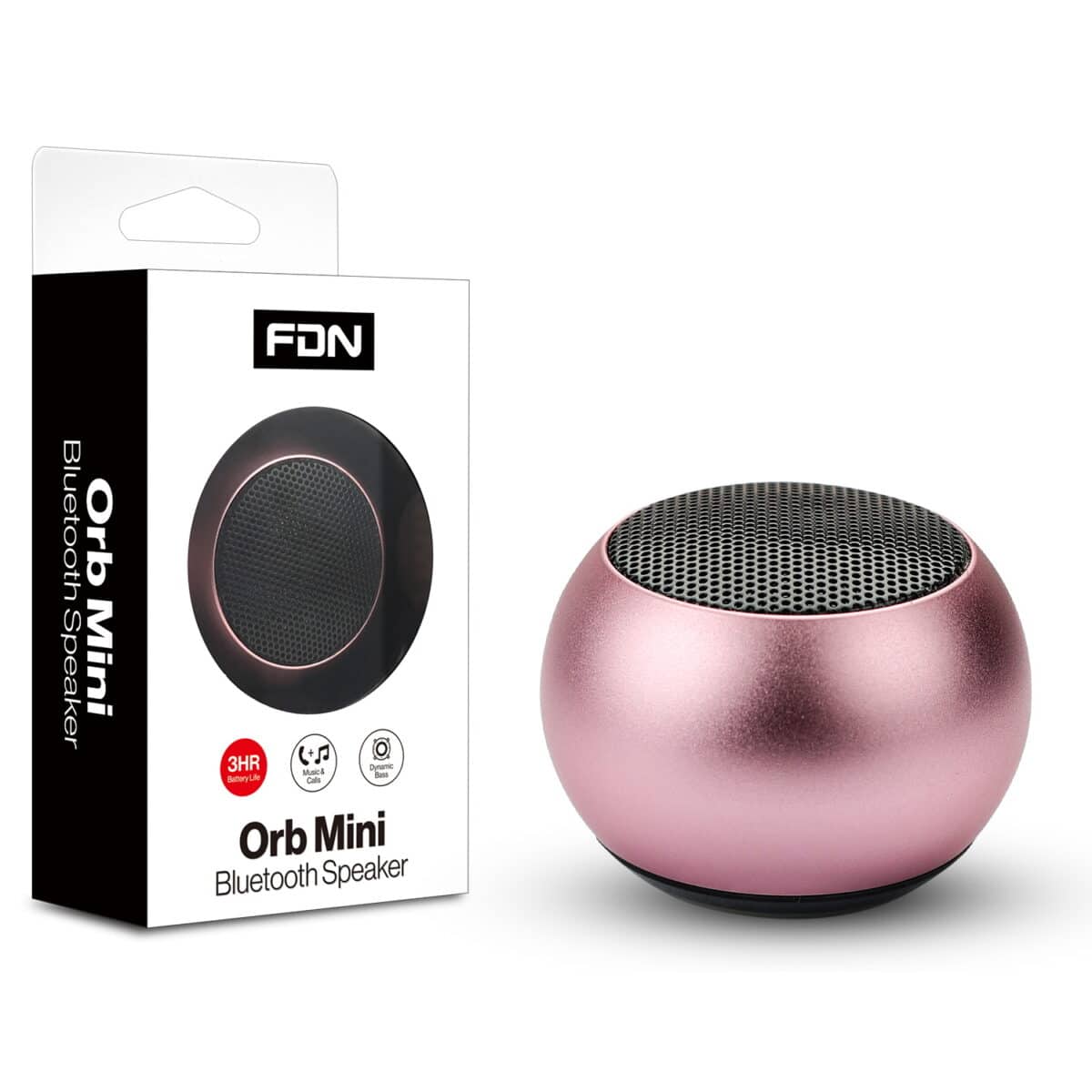 Shining sound, compact size. The FDN Orb Mini Bluetooth Speaker delivers crisp, full-range audio in a sleek metallic aluminum-alloy shell that looks as good as it sounds. Engineered for big sound in a small package, its 3W full-range driver and enhanced bass bring depth and clarity to every beat. Dual pairing mode lets you connect two speakers for an immersive stereo experience, while its ultra-lightweight, pocket-sized design makes it the perfect travel companion. Whether at home, outdoors, or on the go, enjoy up to 4 hours of playtime with seamless Bluetooth connectivity for music and calls. The anti-slip silicone base keeps it stable, and the one-touch control makes answering calls and taking selfies effortless. Designed for portability, style, and performance, the FDN Orb Mini Bluetooth Speaker turns up the sound wherever life takes you.