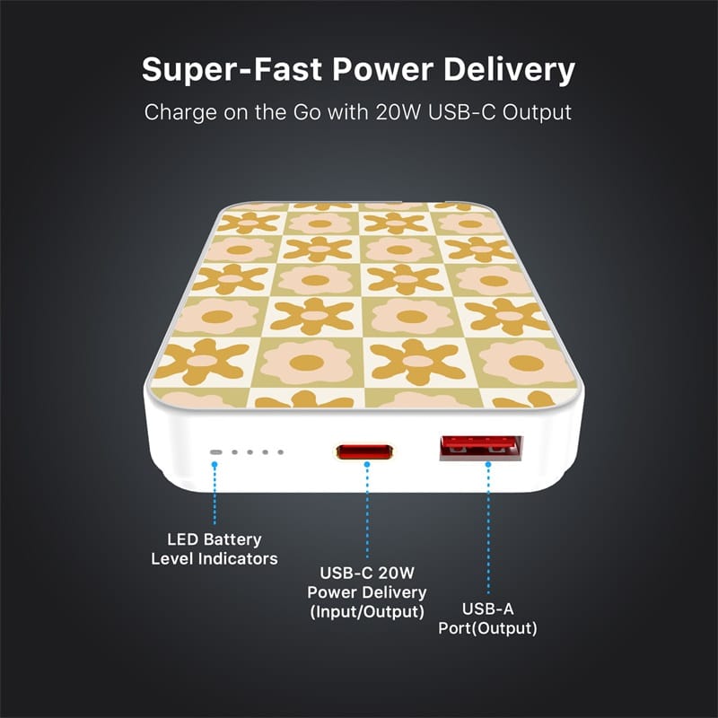 Experiment with every charge and style with the MyBat Design Lab Series Power Bank, where innovation meets bold design. Custom-printed on demand with simply genius designs, this power bank is engineered in the lab to deliver the perfect balance of form and function for reliable charging. With MagSafe compatibility and a powerful magnetic attachment, it securely snaps into place for seamless power delivery. Featuring 15W wireless charging and dual fast-charging ports (20W USB-C PD and 18W USB-A), this power bank delivers up to 30 hours of extra battery life and up to 2x full charges. Smart chip technology ensures safe, efficient charging, while its pocket-sized portability makes it ideal for on-the-go use. Formulated for all tastes, the Design Lab Series Power Bank is built to power your vibe with cutting-edge style and performance.