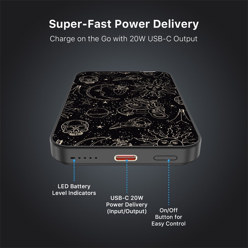 Experiment with every charge and style with the MyBat Design Lab Series Power Bank, where innovation meets bold design. Custom-printed on demand with Simply Genius Designs, this power bank is engineered in the lab to deliver the perfect balance of form and function for portable charging. With MagSafe compatibility and a powerful magnetic attachment, it securely connects for effortless and reliable power. Featuring 15W wireless charging and a 20W USB-C PD port, this compact power bank provides up to 15 hours of extra battery life and 1x full charge. Smart chip technology ensures safe, efficient charging, while its pocket-sized portability and case-friendly design make it perfect for life on the go. Formulated for all tastes, the Design Lab Series Power Bank powers your vibe with compact style and performance.