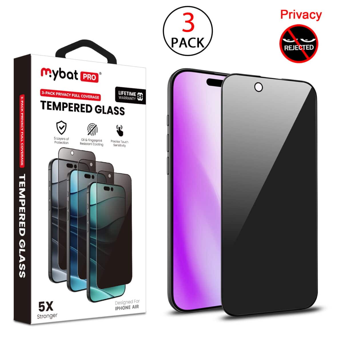 Keep prying eyes away. Safeguard your screen from scratches, smudges, and snooping with the MyBat Pro Privacy Tempered Glass Screen Protector (3-Pack) for iPhone Air. Engineered with a multi-layered defense that’s 5X stronger than standard glass, each protector offers durable, full-screen coverage with a crystal-clear, curved fit. The premium privacy coating ensures your display stays visible only from straight on, keeping your information secure. Ultra-thin 0.33mm glass maintains flawless touch responsiveness, while an oleophobic coating resists fingerprints for lasting clarity. With easy, bubble-free installation and a case-friendly fit, enjoy professional-grade protection for every device—times three.